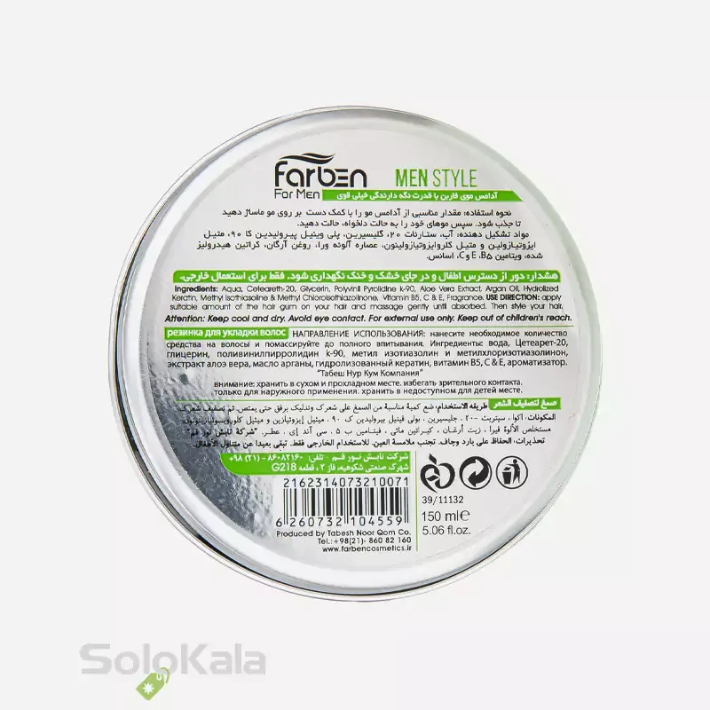 آدامس موی فاربن مخصوص آقایان، محصولی با قدرت نگهدارندگی بالا است که علاوه بر حفظ حالت مو در طول روز، رطوبت مو را تامین کرده و از خشکی آن جلوگیری می‌کند. این محصول برای انواع مو مناسب بوده و ظاهری براق و مرطوب به موها می‌بخشد. ترکیبات غنی این محصول شامل عصاره آلوئه ورا، روغن آرگان، کراتین و ویتامین‌های مختلف است که به ترمیم، تقویت و تغذیه مو کمک می‌کنند. استفاده از آدامس موی فاربن بسیار ساده است و تنها با ماساژ دادن مقدار کمی از آن روی موها می‌توان به نتیجه دلخواه رسید.