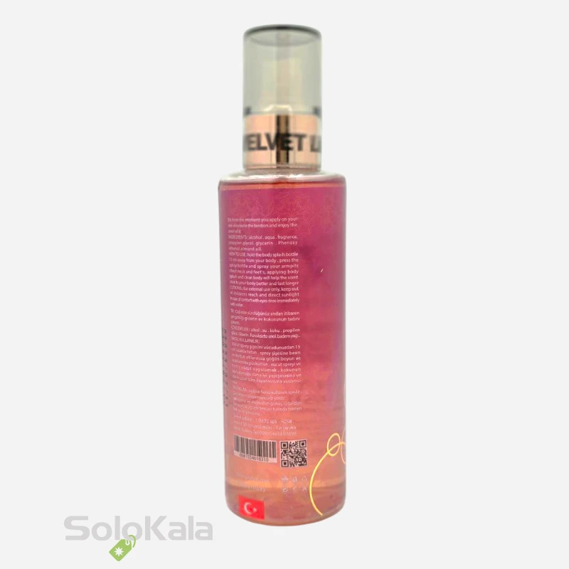 برند Velvet ترکیه در تولید این محصول از مرغوب‌ترین اسانس‌های سوئیسی بهره برده تا برخلاف بسیاری از خوشبوکننده‌های بدن، از ماندگاری و پخش بوی بسیار بالایی برخوردار باشد. علاوه بر رایحه فریبنده، این بادی اسپلش یک محصول مراقبتی برای پوست است؛ فرمولاسیون آن حاوی روغن آرگان و ویتامین E است که پس از حمام، پوست را عمیقاً آبرسانی کرده و لطافتی ابریشمی به آن می‌بخشد.