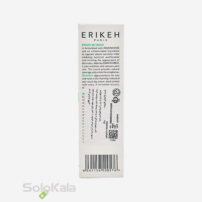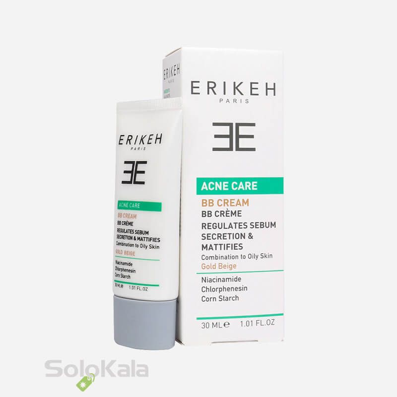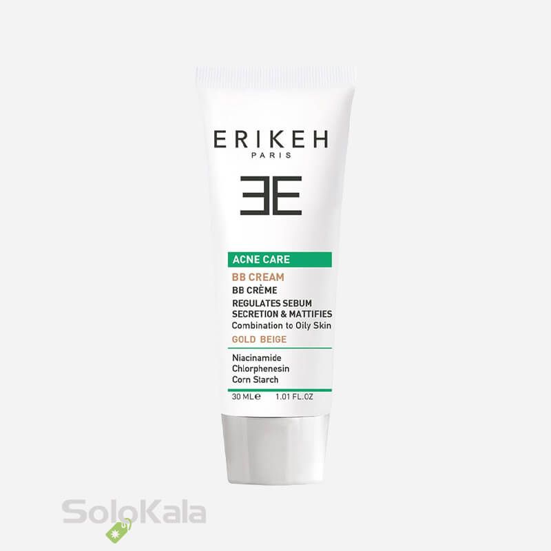 بی بی کرم بژ طلایی اریکه مناسب پوست مختلط تا چرب است. این محصول منافذ باز پوست را جمع کرده و نواقص صورت را می‌پوشاند. بی بی کرم ضد آکنه اریکه حاوی نیاسینامید بوده و باکتری‌های مولد جوش و آکنه را از بین می‌برد. نیاسینامید یا همان ویتامین B۳ موجود در این محصول تولید کلاژن در پوست را نیز افزایش داده و روند پیری پوست را کند می‌کند. این ویتامین لک‌های پوست و قرمزی را از بین می‌برد و از پوست در برابر اشعه‌های مضر خورشید محافظت می‌نماید. همچنین این محصول براقی پوست را رفع نموده و عملکرد سد دفاعی پوست را تقویت می‌کند. بی بی کرم پوست چرب اریکه حاوی کلرفنزین و نشاسته ذرت بوده و غدد ترشح چربی را کنترل می‌کند.