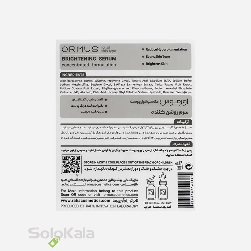 برند اورموس با بهره‌گیری از بیوتکنولوژی پیشرفته و شناخت عمیق میکروبیوم پوست، محصولاتی با کمترین مواد جانبی و بیشترین جذب مواد مؤثر تولید کرده است. سرم روشن کننده و ضدلک اورموس برای پوست صورت و دست طراحی شده و با ترکیبات نوآورانه، به کاهش لک و یکنواختی رنگ پوست کمک می‌کند. این محصول مورد تأیید آزمایش‌های بالینی و متخصصان پوست بوده و مناسب انواع پوست است.