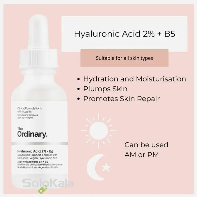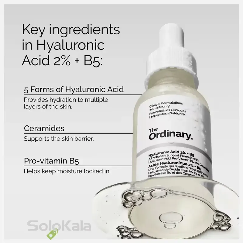 سرم هیالورونیک اسید 2% + B5 اوردینری یک سرم آبرسان است که خشکی پوست را رفع کرده و باعث کاهش خطوط چین و چروک‌ها و بهبود بی‌نظمی‌های بافتی پوست می‌شود. این سرم به‌طور خاص شامل سه نوع هیالورونیک اسید با وزن مولکولی مختلف است که به لایه‌های مختلف پوست نفوذ کرده و باعث مرطوب‌ ماندن پوست و جلوگیری از خشکی پوست می‌شود. همچنین حاوی ویتامین B5 است که به ترمیم و تقویت سد محافظتی پوست کمک می‌کند.