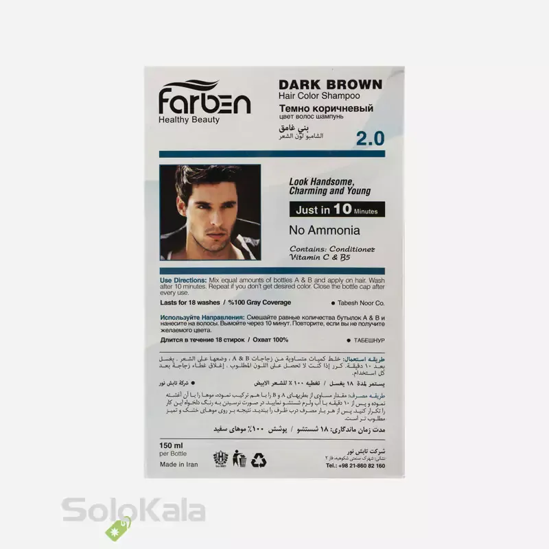 شامپو رنگ قهوه ای تیره فاربن یک محصول کاربردی برای آقایانی است که به دنبال پوشاندن موهای سفید و خاکستری به روشی ساده و سریع هستند. این شامپو با فرمولاسیونی غنی از ویتامین‌ها و نرم‌کننده‌ها، موها را رنگ کرده و در عین حال به تقویت و محافظت از آن‌ها کمک می‌کند. از مزایای این محصول می‌توان به پوشش کامل موهای سفید، رنگدهی سریع و آسان، ماندگاری بالا، عدم وجود آمونیاک و مواد شیمیایی قوی و مناسب بودن برای انواع مو اشاره کرد. با استفاده از این شامپو، آقایان می‌توانند در مدت زمان کوتاهی به رنگ موی دلخواه خود دست پیدا کنند و از یک ظاهر جوان‌تر و جذاب‌تر لذت ببرند.