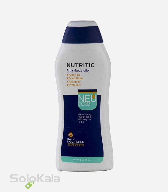 لوسیون بدن آرگان نوتریتیک نئودرم مناسب پوست خشک و خیلی خشک یک محصول از برند معروف Neuderm می‌باشد که مناسب پوست خشک تا خیلی خشک نئودرم حاوی روغن آرگان، شی باتر، آلانتوئین و پروبیوتیک بوده، موجب فعال شدن سیستم ایمنی سلولی پوست می‌شوند که با تولید مواد ضدالتهابی از ایجاد حساسیت پوستی جلوگیری می‌کند. یکی از مزیت‌های خرید لوسیون بدن نوتریتیک آرگان مناسب پوست خشک تا خیلی خشک نئودرم این است که با آبرسانی و حفظ رطوبت در پوست، به نرم شدن و شادابی و سلامت بیشتر پوست کمک زیادی می‌کند.