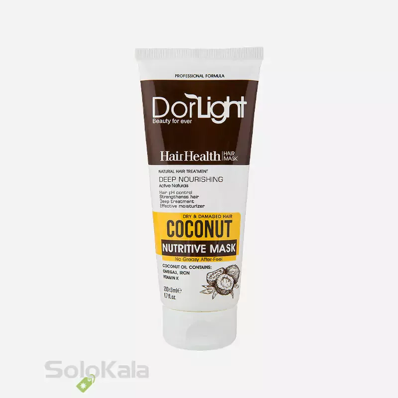 ماسک مو دورلایت با ترکیبات غنی از روغن نارگیل، کراتین، کلاژن، امگا 3، ویتامین K و آهن، یک محصول ترمیم کننده قوی برای موهای خشک و آسیب دیده است. این ماسک با تغذیه عمیق، موها را بازسازی کرده و به آنها نرمی، لطافت، درخشندگی و حجم می‌بخشد. علاوه بر ترمیم، ماسک مو تیوپی روغن نارگیل دورلایت به حفظ رنگ موهای رنگ شده نیز کمک می‌کند.