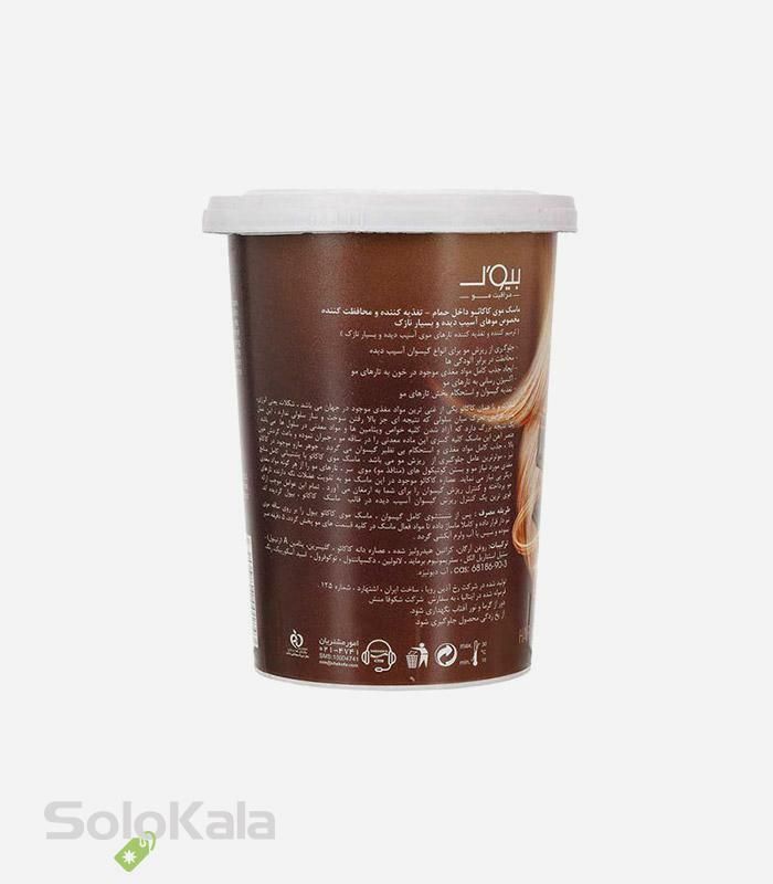ماسک مو کاکائو داخل حمام بیول سرشار از انواع ویتامین، روغن آرگان و کراتین هیدرولیز شده است که با جذب کامل مواد مغذی و افزایش خون رسانی به ساقه‌ی مو استحکام تار مو را افزایش داده و موجب ضخیم شدن تار مو نازک می‌شود.