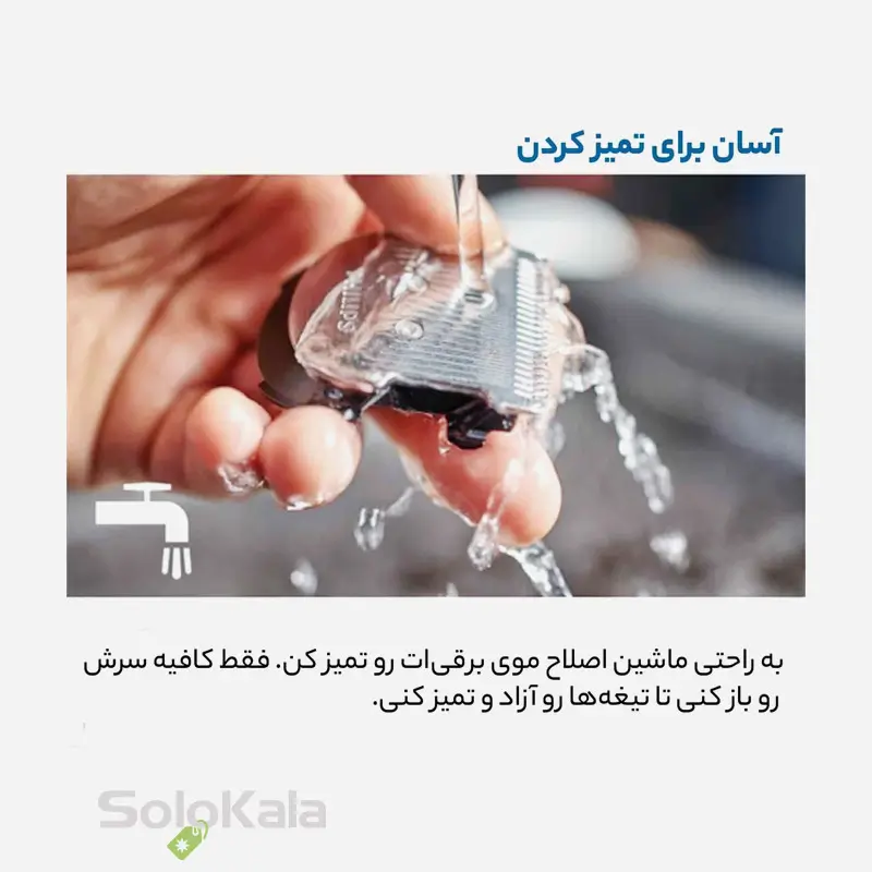 • ضد آب: بدنه‌ی این ماشین اصلاح ضد آب است و به راحتی می‌توانید آن را تمیز کنید.