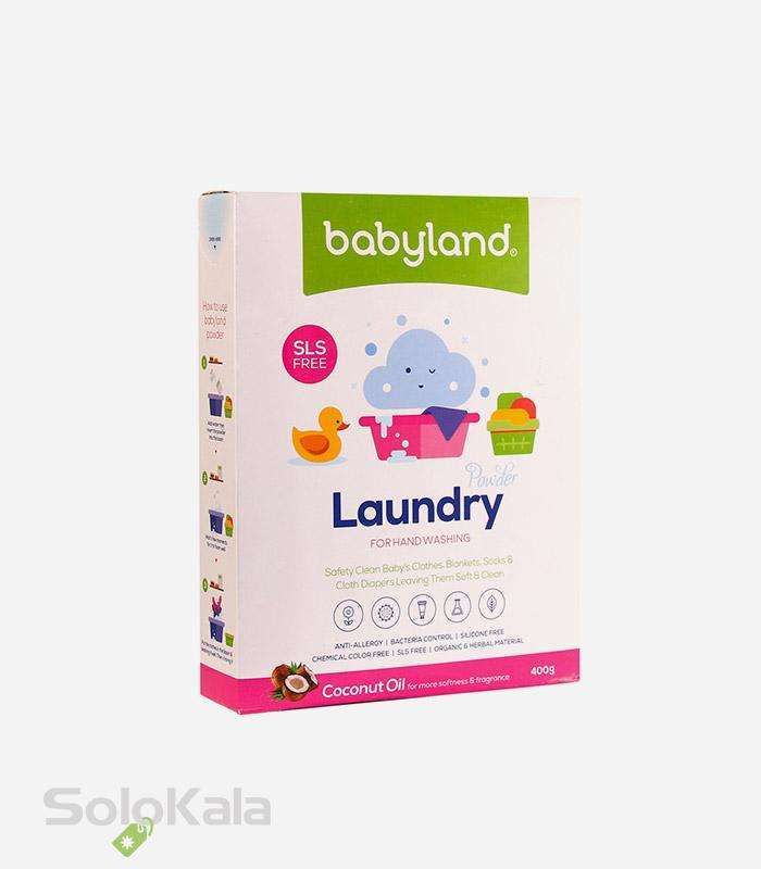 پودر لباسشویی دستی بیبی لند 400 گرمی با بهره‌گیری از روغن نارگیل و در کنار بهترین مواد شستشو دهنده، نوع جدیدی از پودر رختشویی را بدون احساس خشکی بر روی پوست دست و یا هرگونه بوی نامطبوع بر روی البسه پس از شستشو به ارمغان آورده است. سایندگی استاندارد این پودر نرمی فوق‌العاده بالایی را ایجاد می‌کند بافت پارچه با توجه به PH کنترل شده سالم باقی می‌ماند ؛ دچار پرز نمی‌گردد و با بهره‌گیری از اکسید منیزیم در ترکیبات خود با یونیزه نمودن آب و ایجاد بار منفی قدرت زیادی در جداشدن لکه‌های چربی از روی البسه ایجاد می‌کند.