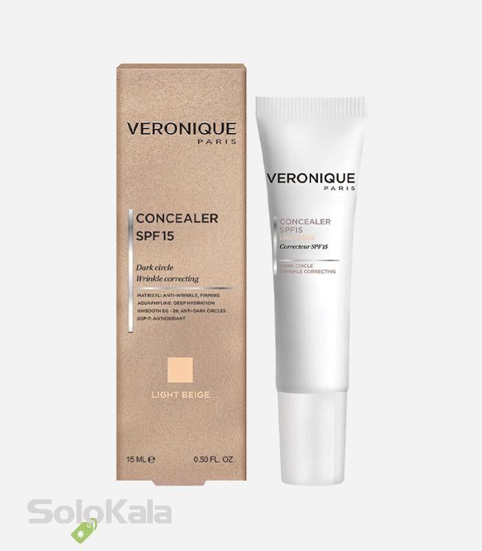 کانسیلر ورونیک رنگ بژ روشن SPF 15 ضمن حفظ رنگ طبیعی پوست، انواع تیرگی‌ها را می‌پوشاند. این محصول حاوی عصاره‌های بابونه، آلوئه ورا و نیاسینامید است. عصاره بابونه موجود در این کانسیلر، جریان خون مویرگی را بهبود بخشیده و مانع از ایجاد لک در پوست می‌شود. این عصاره خارش و سوزش را درمان نموده و چین و چروک‌های اطراف چشم را از بین می‌برد. عصاره آلوئه ورا نیز علائم اگزما را کاهش داده و مانع از بروز جوش و آکنه در پوست می‌شود. کاهش التهابات، کنترل چربی پوست، تامین رطوبت مورد نیاز سلول‌های پوستی، رفع تیرگی‌های زیر چشم و افزایش استحکام پوست از جمله فواید نیاسینامید موجود در این کانسیلر است. کانسیلر SPF۱۵ ورونیک به سبب ترکیبات موثر خود، از پوست صورت در برابر اشعه‌ی UV و سایر عوامل آسیب رسان محیطی محافظت می‌کند. این فرآورده چین و چروک و پف دور چشم را برطرف نموده و فرآیند پیری پوست را به تاخیر می‌اندازد.