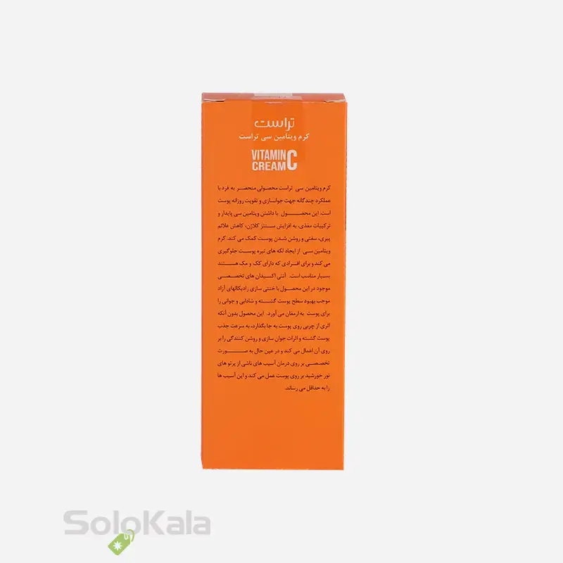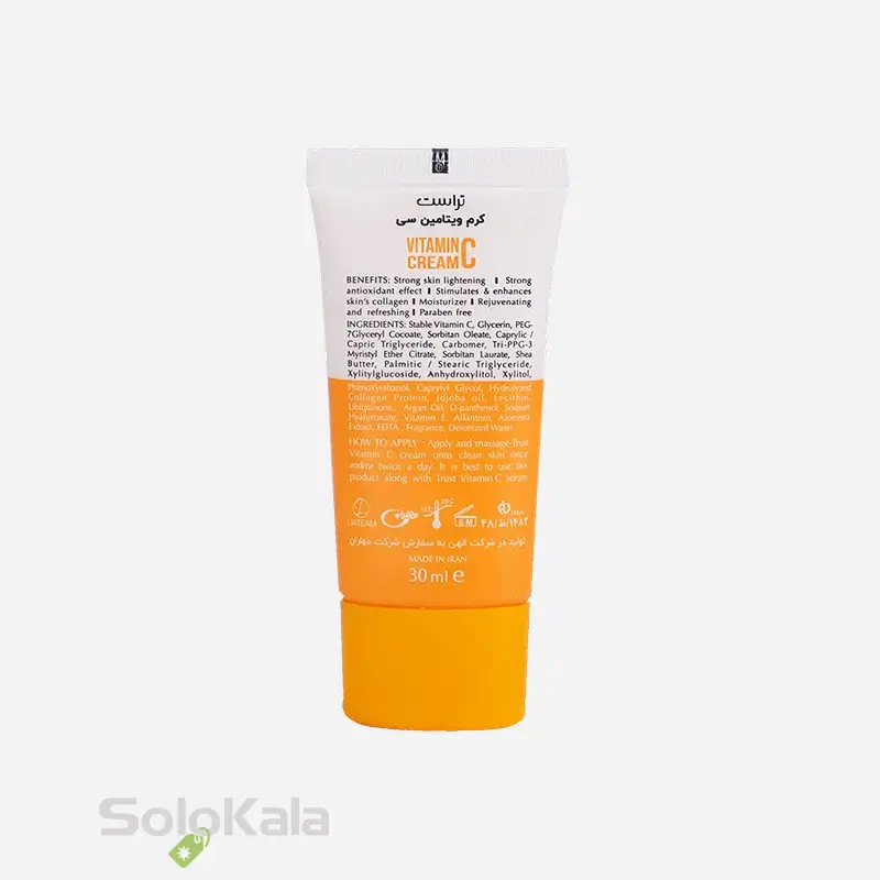 کرم ویتامین C تراست مناسب انواع پوست، با فرمولاسیون غنی از آنتی‌اکسیدان‌های قوی، به کاهش لک‌های پوستی و یکنواخت کردن رنگ پوست کمک می‌کند. کرم ویتامین C تراست علاوه بر روشن‌کنندگی، رطوبت‌رسانی عمقی داشته و از پوست در برابر آسیب‌های محیطی محافظت می‌کند. استفاده منظم از کرم ویتامین C تراست، باعث بهبود شفافیت پوست و افزایش درخشندگی طبیعی آن می‌شود. کرم تراست فاقد مواد حساسیت‌زا بوده و برای انواع پوست حتی پوست‌های حساس مناسب است.