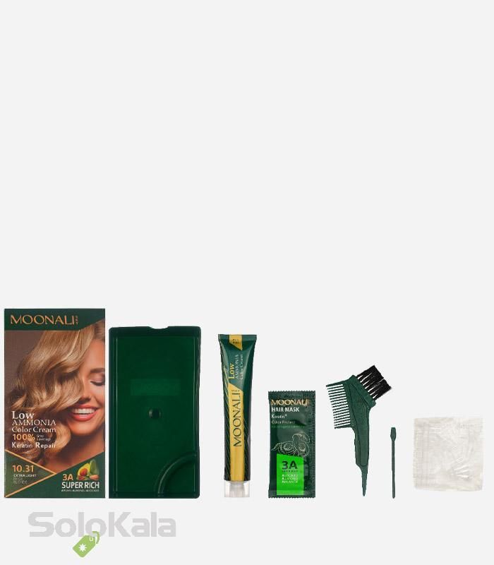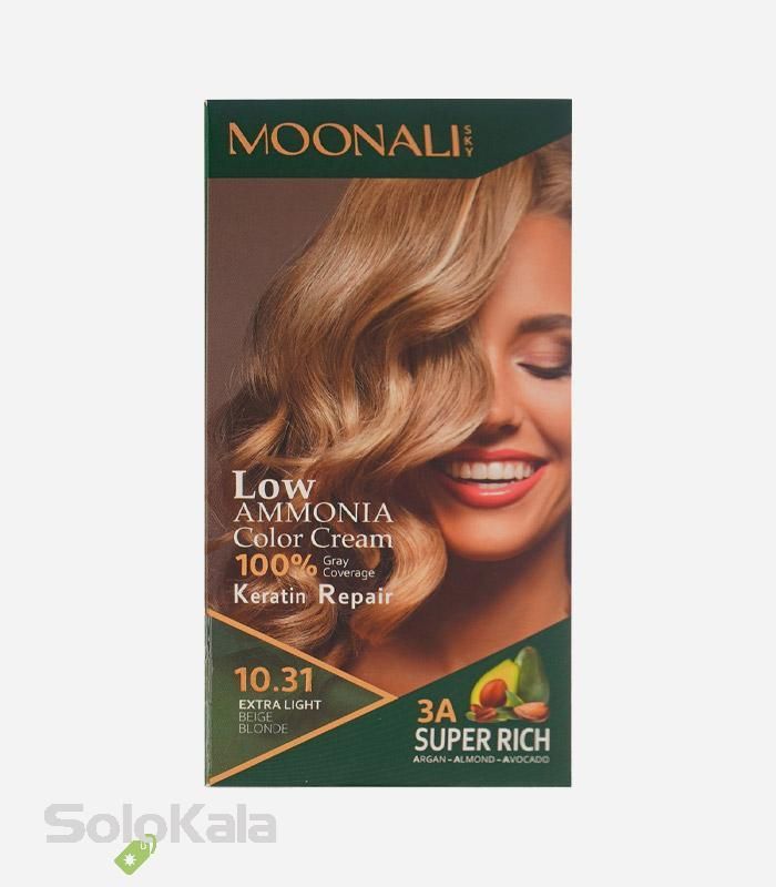 کیت رنگ مو بلوند بژ فوق العاده روشن مونالی کد 10.31 حجم 100 میل دارای موادی مغذی و حاوی کمترین مقدار آمونیاک می‌باشد و باعث سلامت، زیبایی و درخشندگی طبیعی موهای شما خواهد شد. این محصول دارای پکیج کامل رنگ مو که حاوی کلاه و دستکش یکبار مصرف، کرم اکسیدان 9% حجم 150 میلی لیتر، رنگ مو حجم 100 میلی لیتر، فرچه و ظرف آماده سازی رنگ مو و یک ماسک مو محافظ رنگ مو حجم 10 میلی لیتر است که پس از رنگ کردن مو مورد استفاده قرار می‌گیرد. در فرمولاسیون این محصول از سه روغن ترمیم کننده و مغذی آرگان، بادام و آووکادو استفاده شده است که باعث آبرسانی مو، درخشش و ماندگاری طولانی مدت رنگ آن می‌شود.