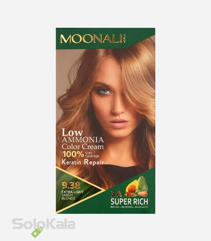 کیت رنگ مو بلوند شنی فوق العاده روشن مونالی کد 9.38 حجم 100 میل دارای موادی مغذی و حاوی کمترین مقدار آمونیاک می‌باشد و باعث سلامت، زیبایی و درخشندگی طبیعی موهای شما خواهد شد. این محصول دارای پکیج کامل رنگ مو که حاوی کلاه و دستکش یکبار مصرف، کرم اکسیدان 9% حجم 150 میلی لیتر، رنگ مو حجم 100 میلی لیتر، فرچه و ظرف آماده سازی رنگ مو و یک ماسک مو محافظ رنگ مو حجم 10 میلی لیتر است که پس از رنگ کردن مو مورد استفاده قرار می‌گیرد. در فرمولاسیون این محصول از سه روغن ترمیم کننده و مغذی آرگان، بادام و آووکادو استفاده شده است که باعث آبرسانی مو، درخشش و ماندگاری طولانی مدت رنگ آن می‌شود.