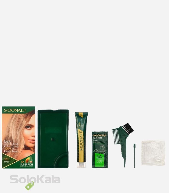 کیت رنگ مو طلایی فانتزی مونالی کد 902 حجم 100 میل دارای موادی مغذی و حاوی کمترین مقدار آمونیاک می‌باشد و باعث سلامت، زیبایی و درخشندگی طبیعی موهای شما خواهد شد. این محصول دارای پکیج کامل رنگ مو که حاوی کلاه و دستکش یکبار مصرف، کرم اکسیدان 9% حجم 150 میلی لیتر، رنگ مو حجم 100 میلی لیتر، فرچه و ظرف آماده سازی رنگ مو و یک ماسک مو محافظ رنگ مو حجم 10 میلی لیتر است که پس از رنگ کردن مو مورد استفاده قرار می‌گیرد. در فرمولاسیون این محصول از سه روغن ترمیم کننده و مغذی آرگان، بادام و آووکادو استفاده شده است که باعث آبرسانی مو، درخشش و ماندگاری طولانی مدت رنگ آن می‌شود.