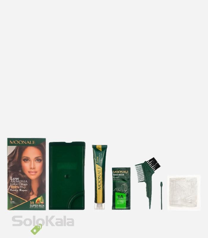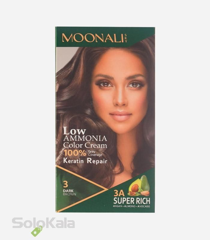 کیت رنگ مو قهوه‌ای تیره مونالی کد 3 حجم 100 میل دارای موادی مغذی و حاوی کمترین مقدار آمونیاک می‌باشد و باعث سلامت ، زیبایی و درخشندگی طبیعی موهای شما خواهد شد. این محصول دارای پکیج کامل رنگ مو که حاوی کلاه و دستکش یکبار مصرف، کرم اکسیدان 6% حجم 150 میلی لیتر، رنگ مو حجم 100 میلی لیتر، فرچه و ظرف آماده سازی رنگ مو و یک ماسک مو محافظ رنگ مو حجم 10 میلی لیتر است که پس از رنگ کردن مو مورد استفاده قرار می‌گیرد. در فرمولاسیون این محصول از سه روغن ترمیم کننده و مغذی آرگان، بادام و آووکادو استفاده شده است که باعث آبرسانی مو، درخشش و ماندگاری طولانی مدت رنگ آن می‌شود.