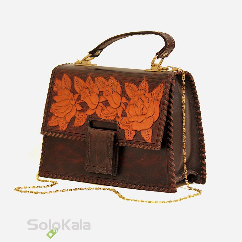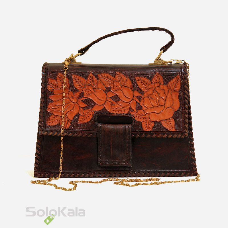 کیف دستی و رودوشی قلم زنی زنانه چرم طبیعی مدل SL1033 یکی از زیباترین و محبوبترین نوع کیفهای چرمیه قلم زنی مناسب بانوان برای استفاده روزانه و مجالس هست. این کیف یه بند دستی داره و البته قابلیت اتصال بند زنجیری هم داره. طرح و نگار زیبای این کیف که با هنر دست قلم زنی حک شده، واقعا آدمو به وجد مییاره.